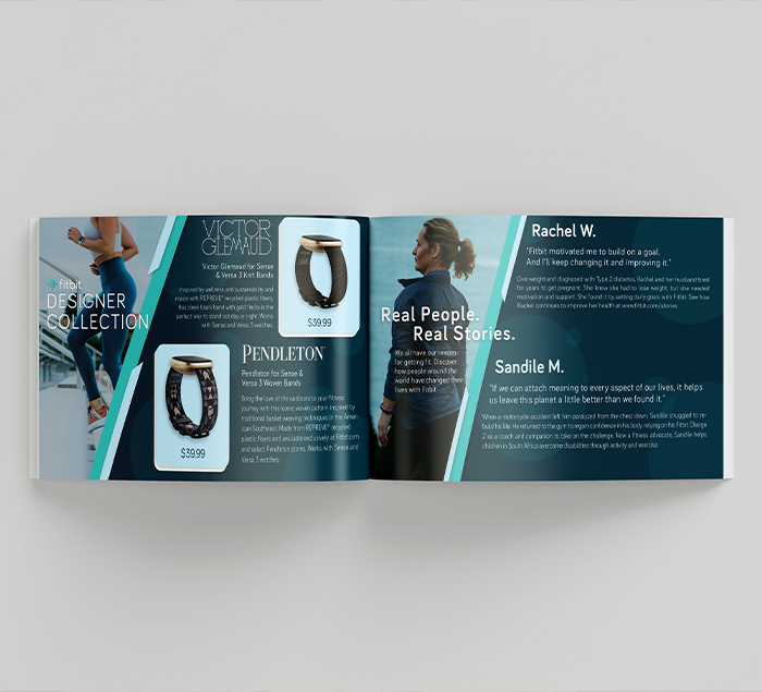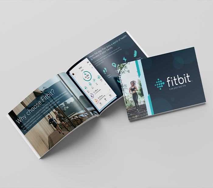 These mockups showcases an 8 page booklet, featuring the fitbit mission, products, designer collection, consumer stories and app features.