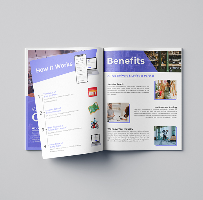 Pamphlet design for my internship. The goal of this project was to make a pamphlet that gives an overview of what the company does and attract local business/vendors to our company, showing how the company works, how other business use it and the benefits. The pamphlet is for digital distribution, but can also become a physical, printed booklet.
