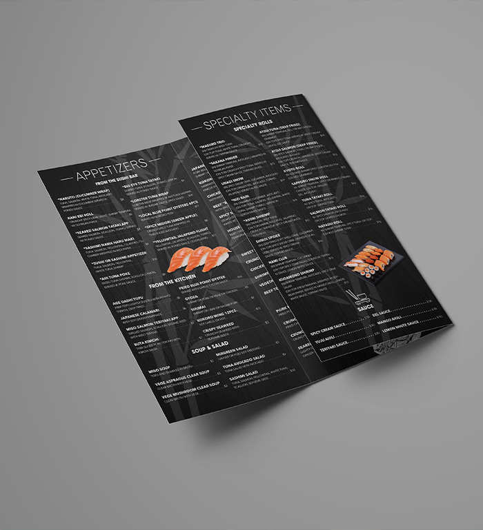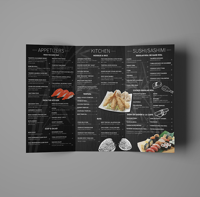 The objective of this project was to design a menu for a real or fictitious restaurant. I decided to design a menu for a mock Japanese restaurant. I love minimalist designs and approached this project with that in mind. I wanted a clean, simple look, almost as if you are in a high end establishment and I believe I achieved my goal.