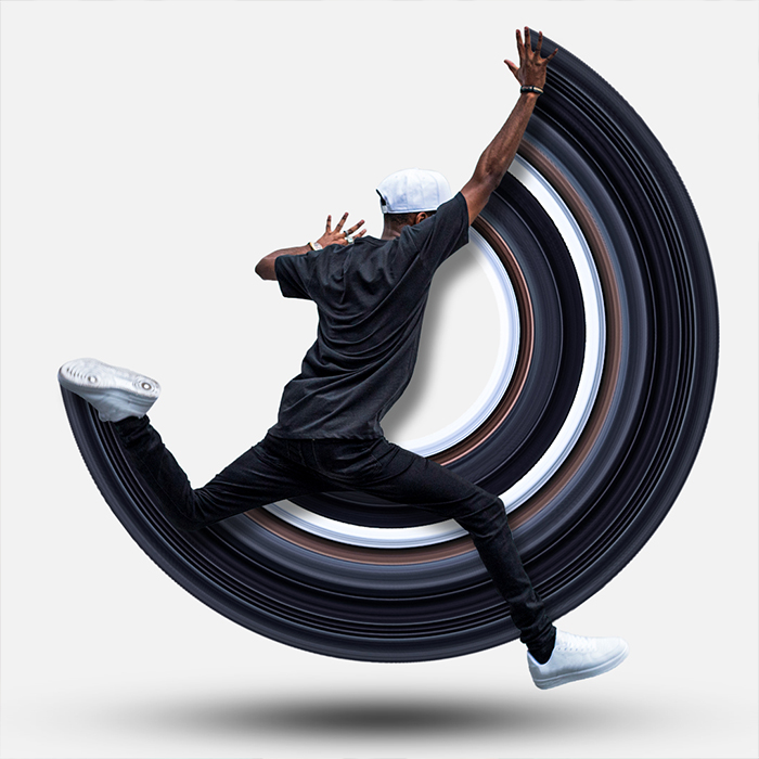 This is a personal project I made experimenting with the RGB channels in Photoshop mixed with the marquee tool, giving it a retro tv glitch effect with added illustrated shapes.