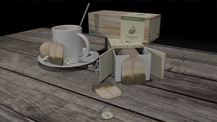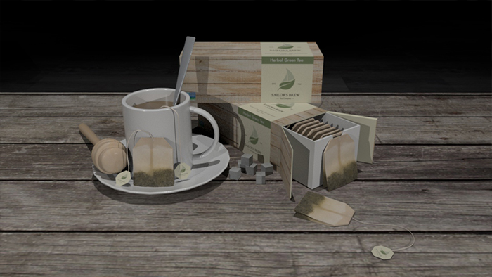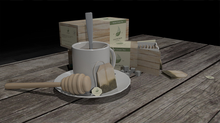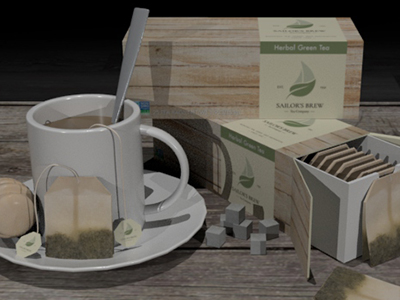 Product design built and rendered in MAYA. The simple logo and label was designed in illustrator and texture mapped usuing Photoshop. Each images shows different angles of the render to showcase the tea product with other similar objects related to to product itself. (Made in MAYA)